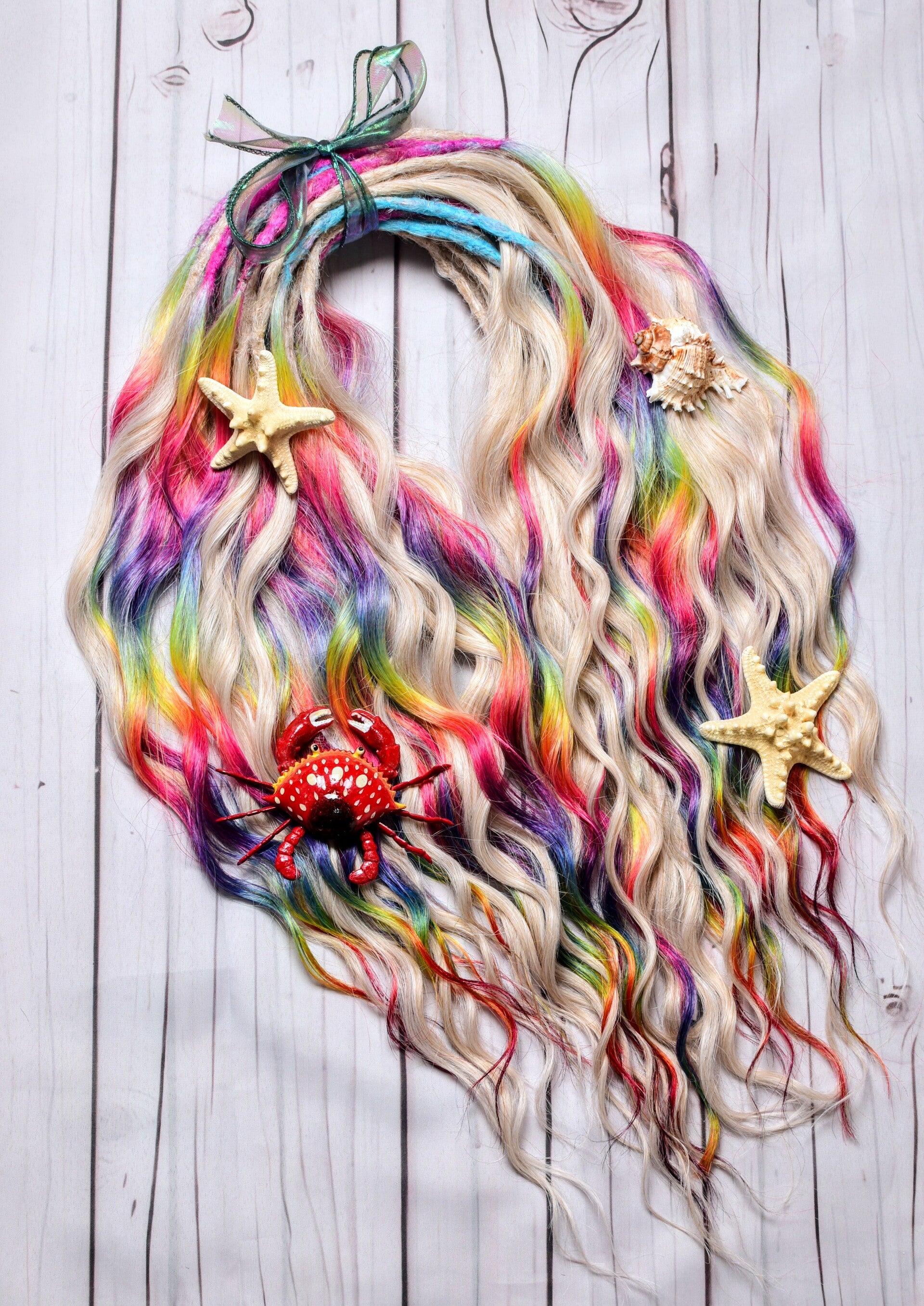 Full set of 50 DE Brushable curls in the much sought-after "glitch" or rainbow colours( 20 rainbow, 30 natural shade ). These sets are hand crocheted with a dreaded centre of 6 to 8 inches. The dreadlock can either be centred or offset to one side. This set is 24 inches long and can be worn up to 6 weeks for a temporary style and can be reused. This hair can be left to dread up or can be brushed daily for a beautiful, wavy look.