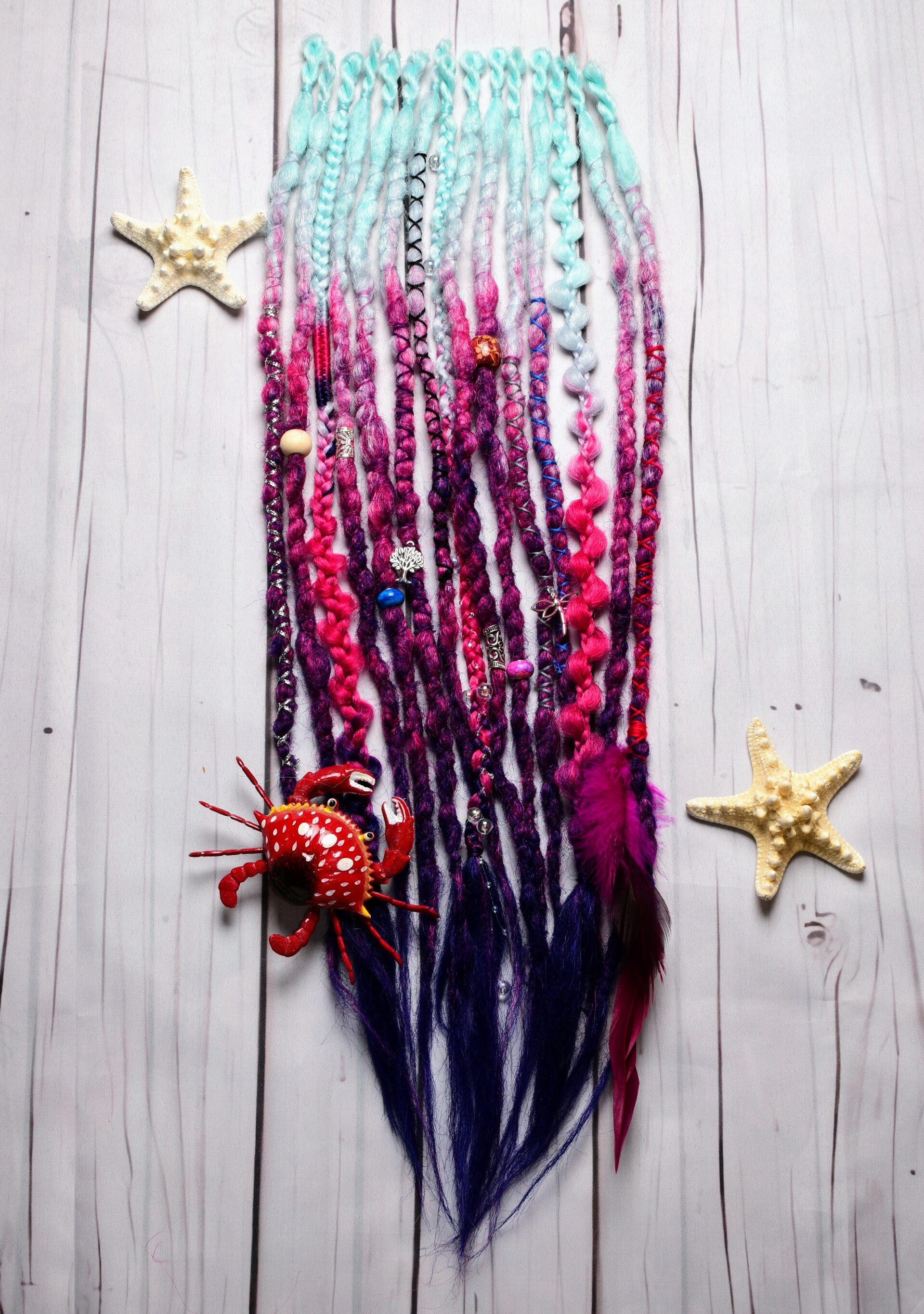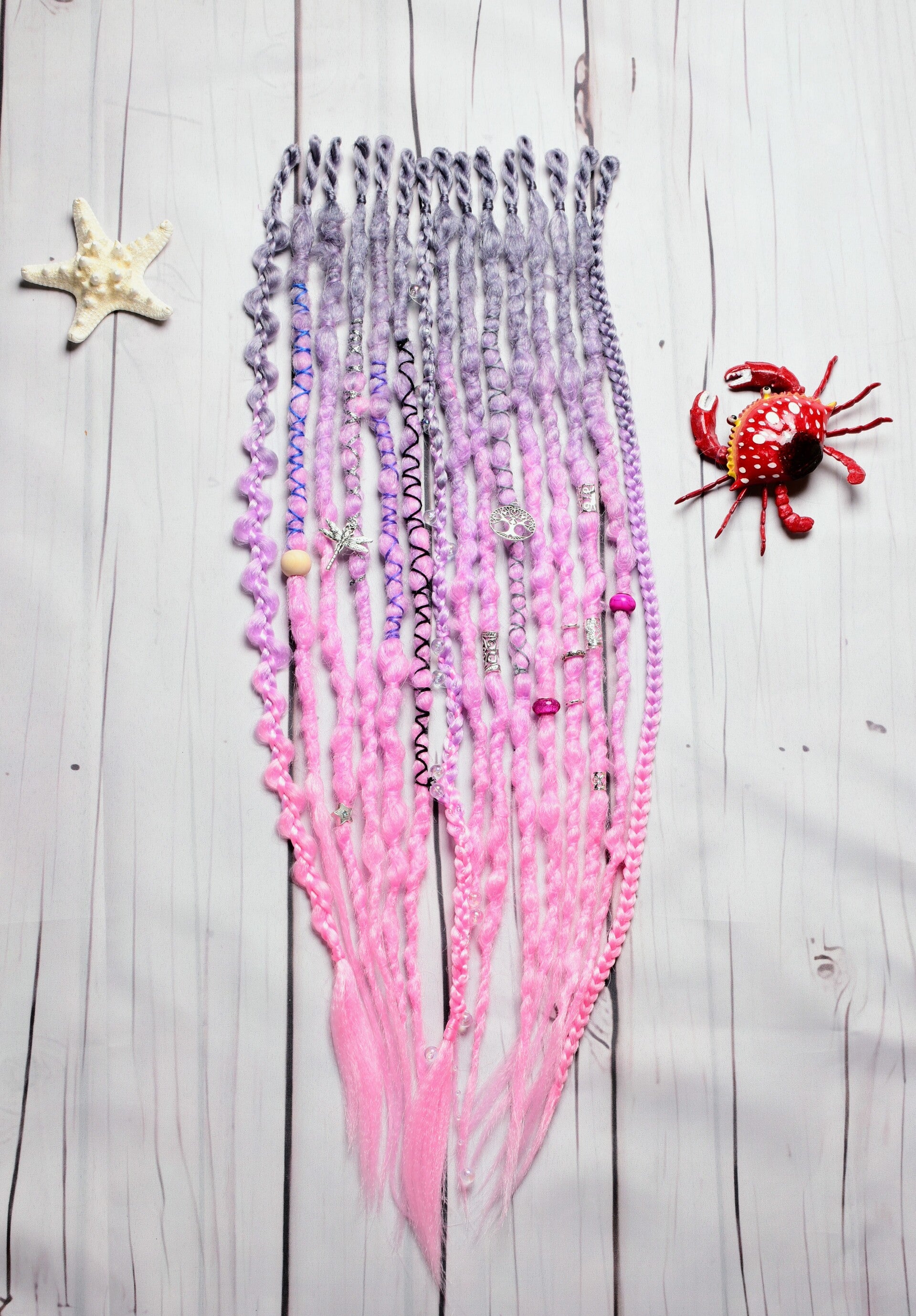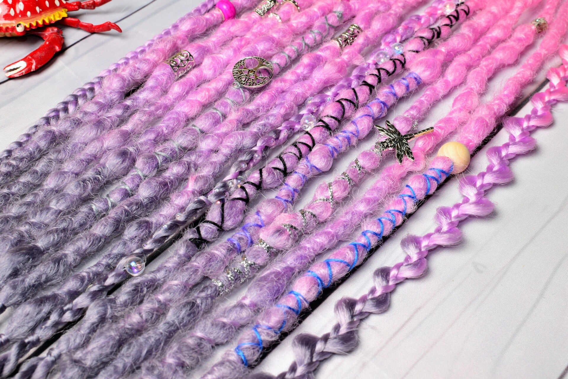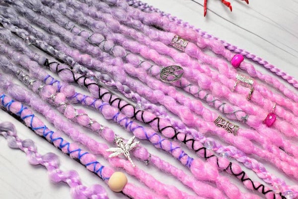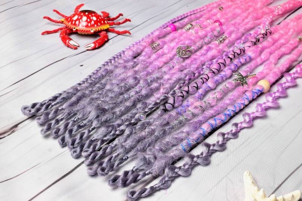 A unique set of 24 inch single ended dreadlocks. These sets are ideal as an accent set or as a partial set. Simply braid into loose hair or loop onto nautural dreadlocks. Each set comes beautifully decorated as shown and is crocheted into a popcorn texture.