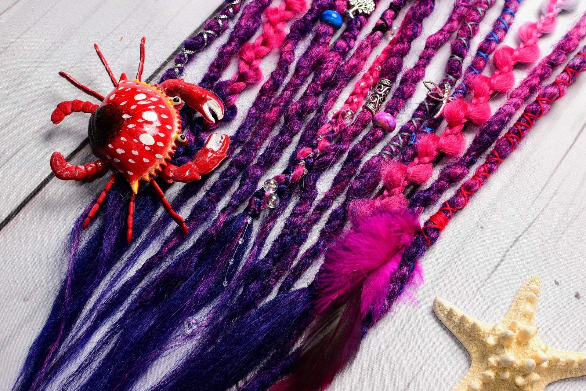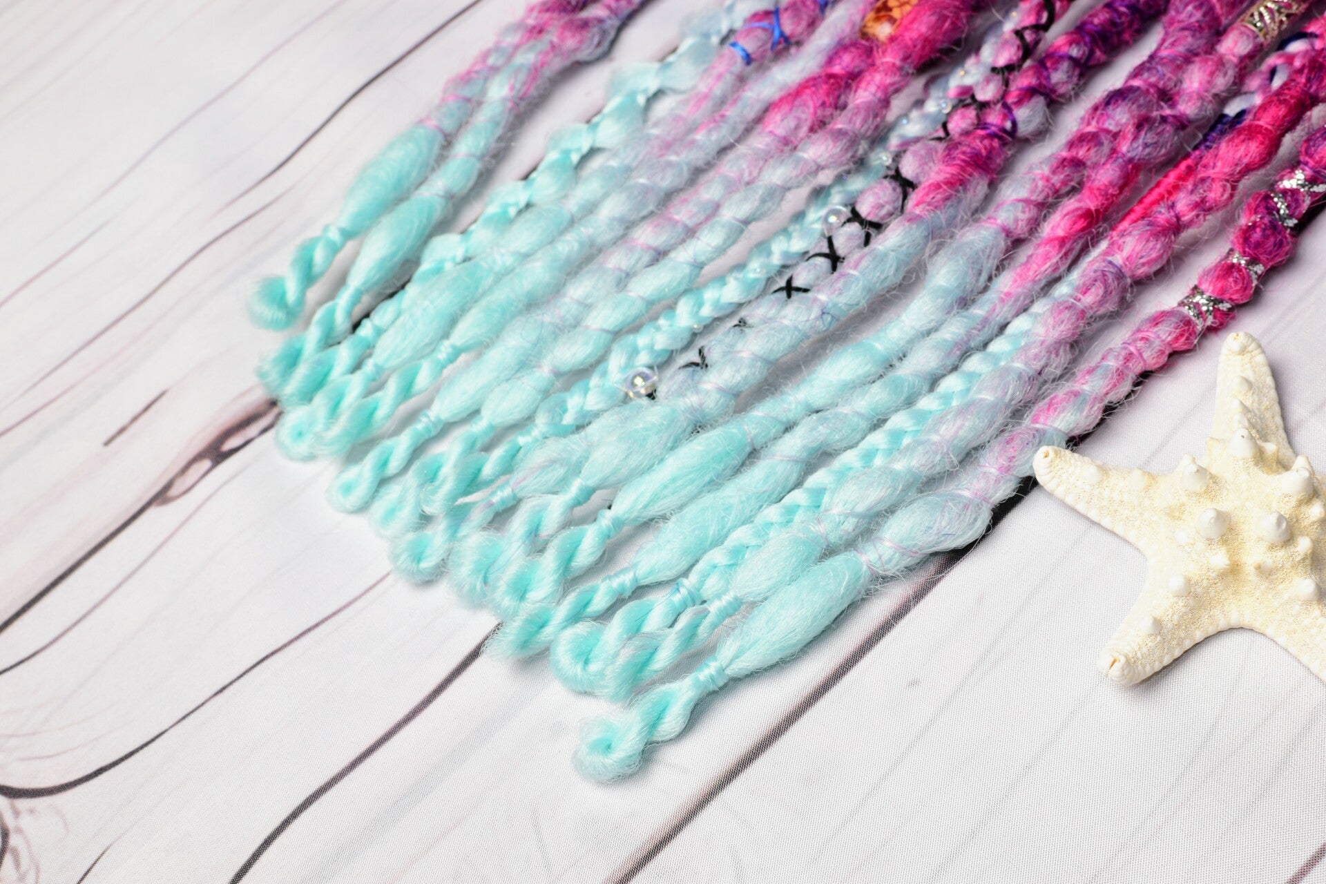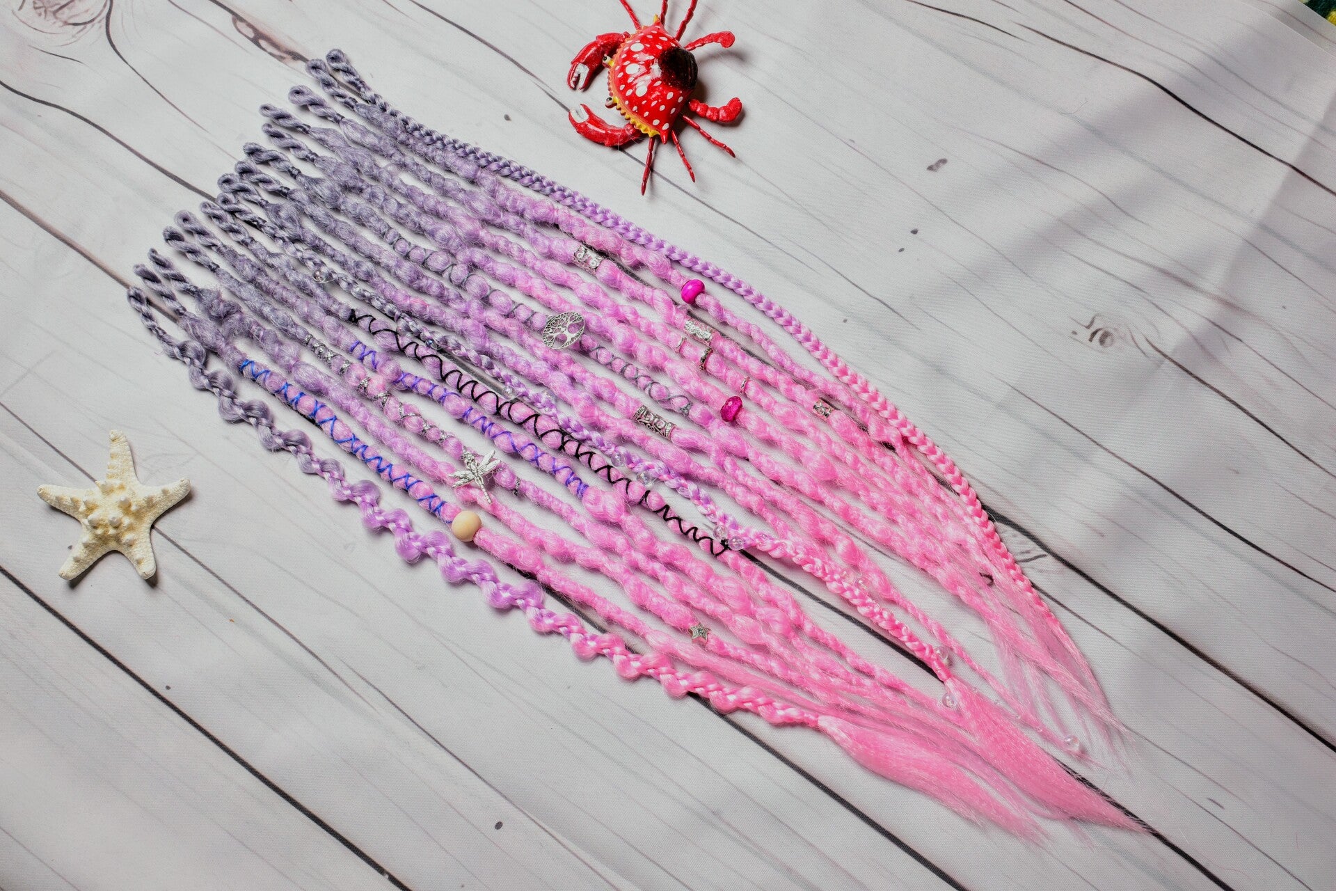 A unique set of 24 inch single ended dreadlocks. These sets are ideal as an accent set or as a partial set. Simply braid into loose hair or loop onto nautural dreadlocks. Each set comes beautifully decorated as shown and is crocheted into a popcorn texture.